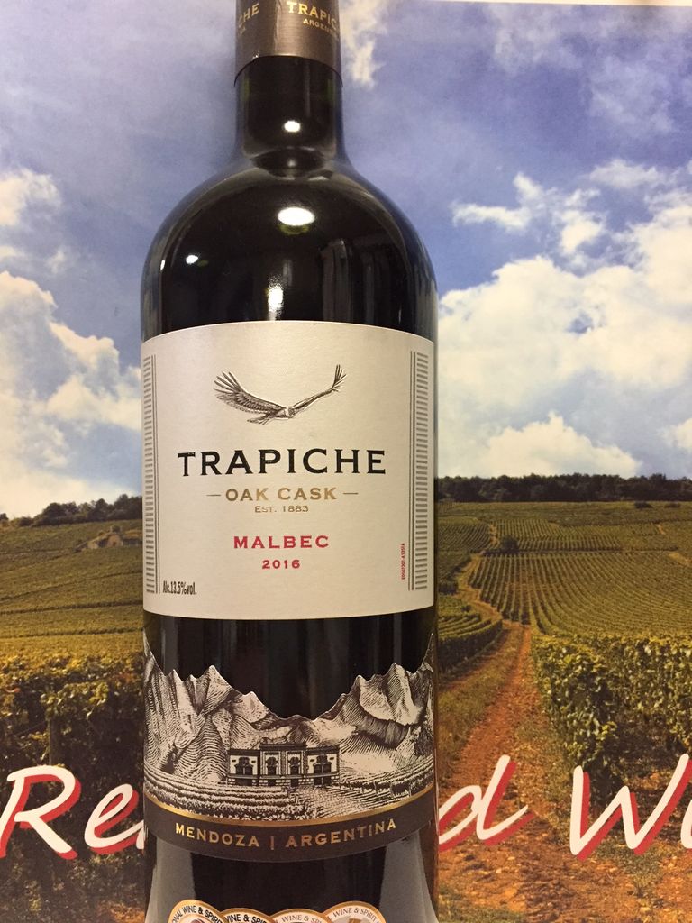 Trapiche oak cask malbec 2016 from mendoza argentina purple colored the nose offers up plum and black cherry notes with a touch of black pepper. Finishes spicy and full with chewy tannins. The palate is soft and round with ripe saturated berry flavors.